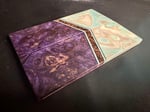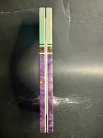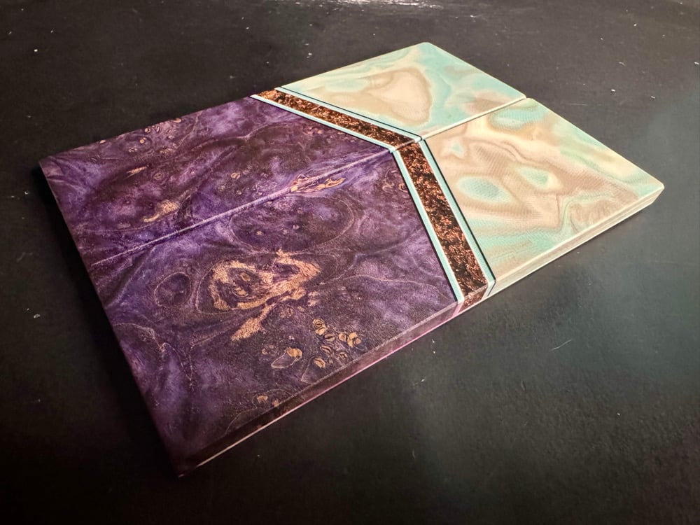 Tiffany burl G10 paired with purple stabilized maple burl. Copper leaf resin spacer with g10 accents and liner. Scales measure 1/4"x1-13/16"x5-7/16".