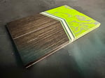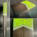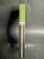 Toxic green & grey burl G10 paired with clear stabilized bog oak. Faux ivory spacer with g10 accents and liner. Scales measure 1/4"x1-11/16"x5-3/8".