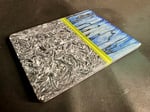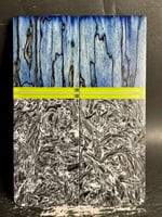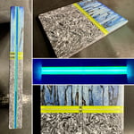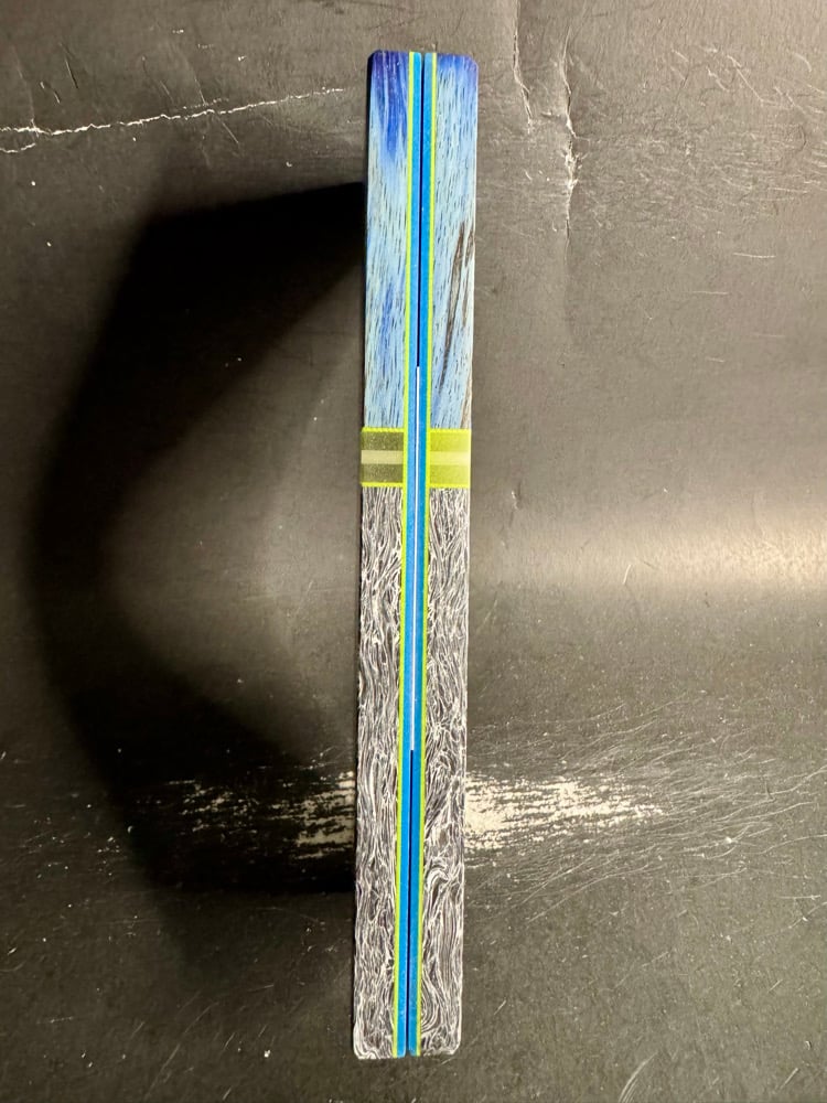 Blue stabilized spalted tamarind paired with Fat Carbon polar white carbon fiber. Clear resin & GLOW spacer with g10 accents and double liner. Scales measure 5/16"x1-7/8"x5-9/16".