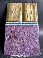 Giraffe bone paired with purple stabilized maple burl. Tru-stone & carbon fiber spacer with g10 accents and liner. Scales measure 5/16"x1-3/4"x5-7/16" at its smallest points.