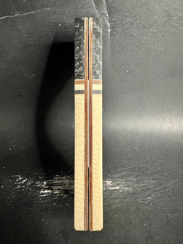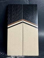 Crosscut carbon fiber paired with faux ivory. Ivory & micarta spacer with g10 accents and micarta liner. Scales measure 5/16"x1-1/2"x5-3/16".