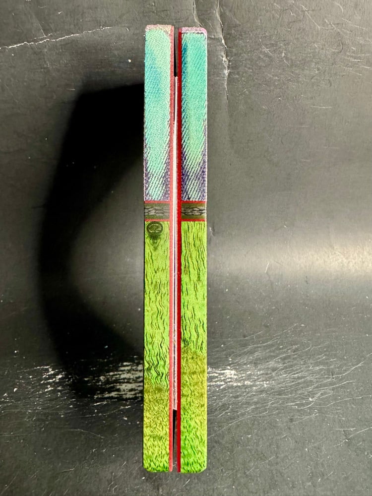 G-carta micarta paired with green stabilized curly narra. GLOW carbon fiber spacer with g10 accents and liner. Scales measure 3/8"x1-3/4"x5-1/4".